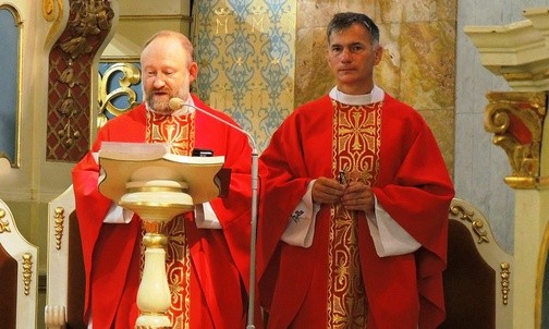 Kapucyn o. Marek Socha i ks. Kazimierz Walusiak w kościele św. Macieja w Andrychowie