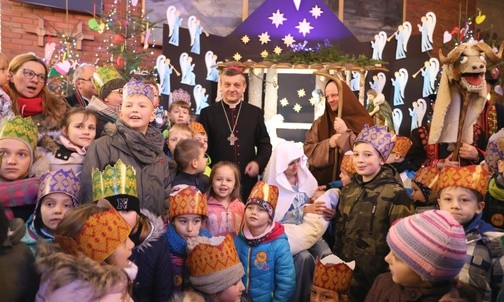Przy betlejemskiej szopce w kościele św. Maksymiliana - bp Roman Pindel z najmłodszymi uczestnikami orszaku