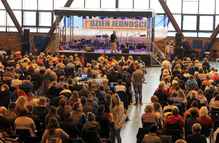 Cały dzień modlitwy, wykładów i budowania więzi. Konferencja "Uczeń-Misjonarz w mocy Ducha Świętego" w hali MOSiR była też dniem jedności - Szkoły Nowej Ewangelizacji z diecezji gliwickiej z jej 19 filiami i około 30 sfederowanych wspólnotami. Ekipa odpowiedzialna za wydarzenie liczyła sto osób, modlących się wstawienniczo było 40.