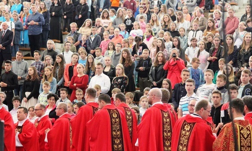 Zaraz po adoracji krzyża rozpoczęła się Msza św. pod przewodnictwem bp. Romana Pindla, którą koncelebrowali parafialni i dekanalni duszpasterze młodzieży, służby liturgicznej, grup, stowarzyszeń i innych wspólnot z całej diecezji. Śpiew podczas Eucharystii prowadziła młodzieżowa diakonia muzyczna Ruchu Światło-Życie. W procesji z darami chleba i wina wolontariusze Szkolnych Kół Caritas przynieśli plecaczki ze szkolną wyprawką, przygotowane w ramach ogólnopolskiej akcji Caritas "Tornister pełen uśmiechów".