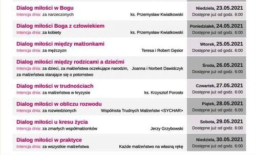 W sobotę 22 maja już o 6.00 rano w mediach społecznościowych będzie można wysłuchać pierwszej konferencji wprowadzającej w 8. Tydzień Modlitw za Powołanych do Małżeństwa, któremu w tym roku towarzyszy główny temat: "Dialog miłości".