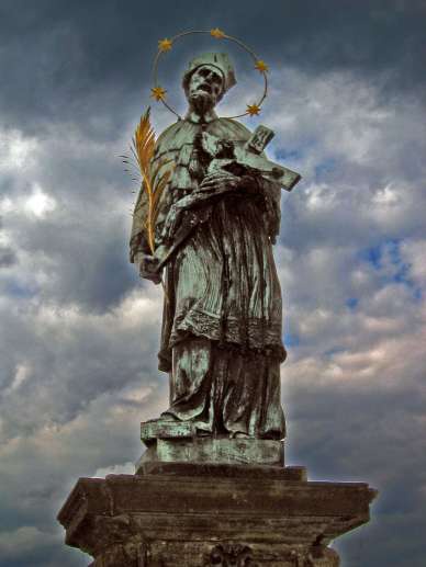 Z racji sposobu swej męczeńskiej śmierci – to jest utopienia w Wełtawie – bohater tej historii opiekuje się przede wszystkim groźnym żywiołem wody. Stróżuje zatem przy mostach, groblach, fosach, przeprawach rzecznych, rozdrożach. Ratuje tonących, chroni od rozmaitych nieszczęśliwych wypadków z wodą w tle. Jego orędownictwo było tak oczywiste w tej kwestii, że z jednej strony bronił ludzi na Śląsku przed powodzią, a z drugiej widniał na galionach korsarskich okrętów hiszpańskich i portugalskich, które pustoszyły wody Nowego Świata. Zatem daleko od rodzinnego Pomuku koło czeskiej Pragi odpłynął nasz dzisiejszy patron, św. Jan, na falach zbiorowej wyobraźni. Nic w tym zresztą dziwnego, skoro w swojej istocie wiemy o nim tylko tyle, ile po jego śmierci w wodach Wełtawy, w roku 1393, przekazywali sobie z ust do ust ludzie. A przekazywać sobie historię tego męczennika musieli w ten właśnie sposób, bo ówczesny król niemiecki i czeski, Wacław IV Luksemburski, który przyczynił się do śmierci św. Jana Nepomucena, żył sobie w najlepsze aż do roku 1419, to jest przez kolejne niemal ćwierć wieku. To ludzie zatem sekretnie przekazując sobie historię dzisiejszego kapłana, doktora prawa po uniwersytecie w Padwie i drugiej osoby po praskim metropolicie, wzbogacili ją o najbarwniejszy element, czyli tajemnicę spowiedzi królowej Zofii. Tajemnicę, którą chciał poznać król Wacław z najlepszego źródła, to jest od jej spowiednika św. Jana z Pomuka. A ponieważ nasz patron milczał w tej sprawie uparcie, więc zabrał ją ze sobą w odmęty Wełtawy. Tyle zapisał ponad pół wieku po śmierci św. Jana z Pomuka Tomasz Ebendorfer w swojej "Kronice". Odtąd również nasz dzisiejszy patron, oprócz orędowania w kwestiach związanych z żywiołem wody, otrzymał także zadanie pomagania wszystkim, którzy muszą z racji pełnionych obowiązków zachować tajemnicę, pozostać lojalnymi i wykazać się cywilną odwagą, by bronić czyjegoś dobrego imienia. Oczywiście co do przyczyn męczeńskiej śmierci św. Jana Nepomucena, historycy są nieco odmiennego zdania, dowodząc na podstawie dokumentów, że raczej chodziło o to, że nasz patron padł ofiarą sporu, jaki król Wacław, zwolennik anty-papieża, toczył z biskupem Pragi, który pozostał wierny prawowitemu papieżowi, ale w jednej kwestii pozostają oni zgodni z ludowym przekazem – dzisiejszy patron nie splamił się złamaniem danego słowa. O tym, jak głębokie to było przekonanie, najlepiej świadczy zresztą pewien wierszyk, który od XVIII wieku zaczął krążyć po Śląsku w wersji czeskiej, niemieckiej i polskiej: "Święty Janie, coś zmarł w męce, trzym nad nami swoje ręce, by nam Bóg dał, co dał Tobie, by nasz język nie zgnił w grobie."