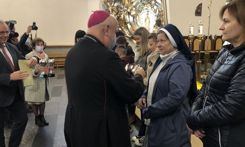 Bp Piotr Greger wraz ze starostą Andrzejem Płonką wręczył nagrody dla szkoł wyróżniających się w poprzednim roku w działaniach na rzecz hospicjum.