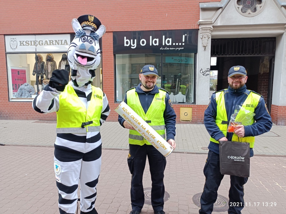 Chorzowscy strażnicy przekonywali dziś mieszkańców Chorzowa do noszenia odblasków. Pomagała im Zebra Basia - maskotka Straży Miejskiej.