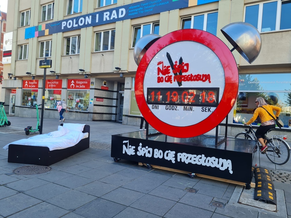 Był już w w Warszawie, Gdańsku, Wrocławiu i w Białymstoku a teraz na kilkadziesiąt godzin stanął w Katowicach. Chodzi o duży budzik, który odlicza czas do wyborów w ramach profrekwencyjnej kampanii pod hasłem "Nie śpij, bo Cię przegłosują”.